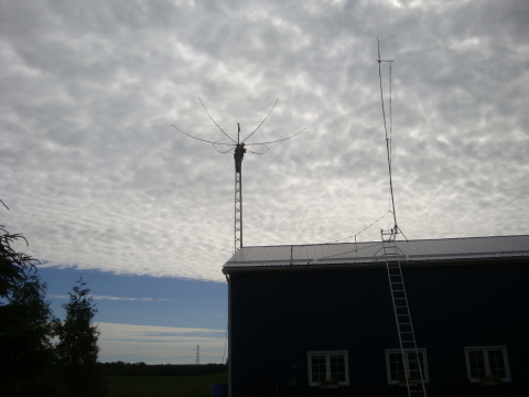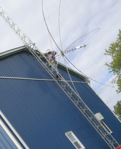 Anyways, it was fun putting together and is really well built. Took one day to build and the next day to install. I had to harness the XYL Linda to pull it up (and take pictures) as I guided it up the tower to avoid the wires snagging on the panel screws on the side of the barn. I couldn't figure out how to use the gin pole, that I picked up at the Central Ontario Hamfest last week, without getting all tangled up in the hexbeam wires. So I went with pulling up to the tower top and then dead-lifting it through the thrust bearing and into the rotator (a TV rotator is all that is needed). It is supposed to weight only 25lb. But add the RG-215 coax and a small mast section (21" of 1.5" OD aluminum) and this was all I could handle. Fortunately there was no wind at all, rare at my hilltop QTH. Next time (?) I'll use the gin pole!